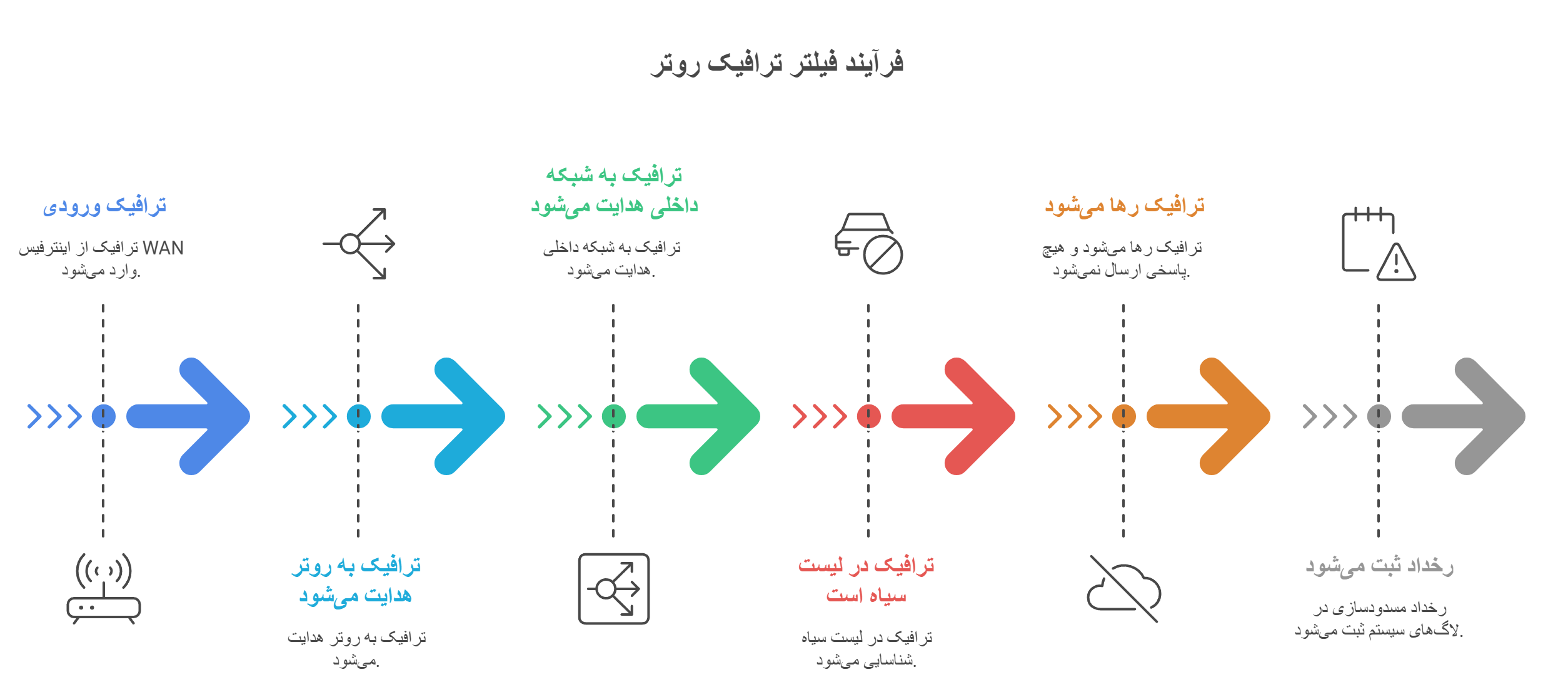 1. ابتدا: میکروتیک بررسی می‌کند که آیا IP مبدأ در لیست سیاه هست؟ اگر بله، بلافاصله‌اش مسدود کن (drop).